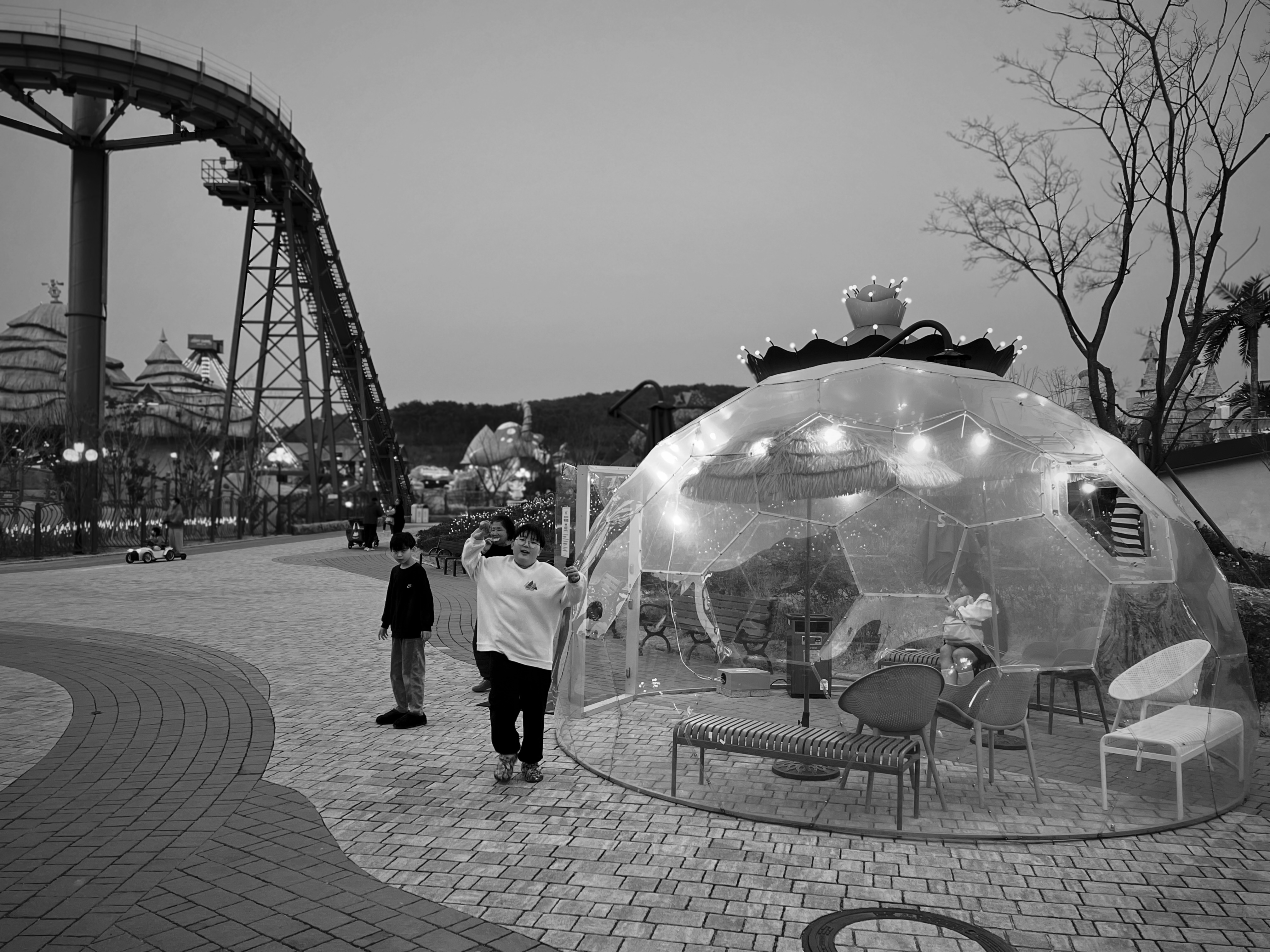 후룸라이드를 타고 옷이 젖어서 오뎅국물 하나 사서 마시고 원형돔이 있는 곳에서 몸을 따뜻하게 할 겸 좀 쉬다 가기로 했다.