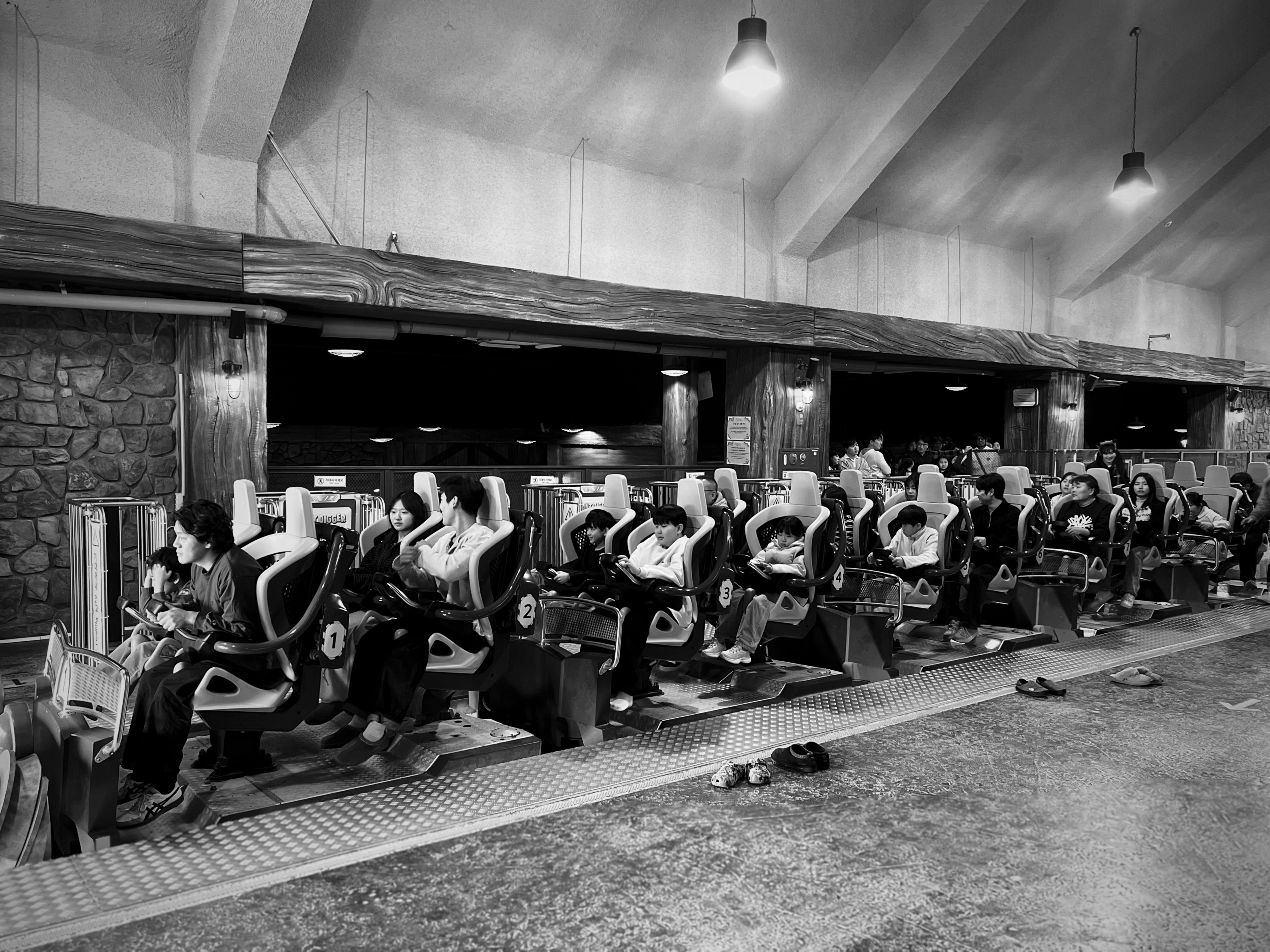 좀 돌아다니다 점심먹을 곳을 찾아봤다. 역시... 부산은 롯데리아 ㅋㅋ 햄버거 하나씩 먹고 후룸라이드를 타러 갔다. 정식명칭이 오거스후룸이다. 입장 전에 꼭 우비를 입으라고 했지만 (유료구매) 아이들은 그냥 탄다고 한다. 부산날씨가 덥긴 했지만... 45분쯤 대기했던 거 같다.